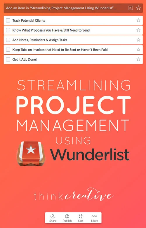 Abagail and I have spent many moments discussing how we manage Think Creative’s projects. We are in this together and I have taken responsibility for invoicing and will occasionally jump on proposal writing when needed. But, how do we keep track of what proposals need sent, if we have received a response from a prospective client, or if a client has been invoiced and payment received. Our solution to project management is Wunderlist.
